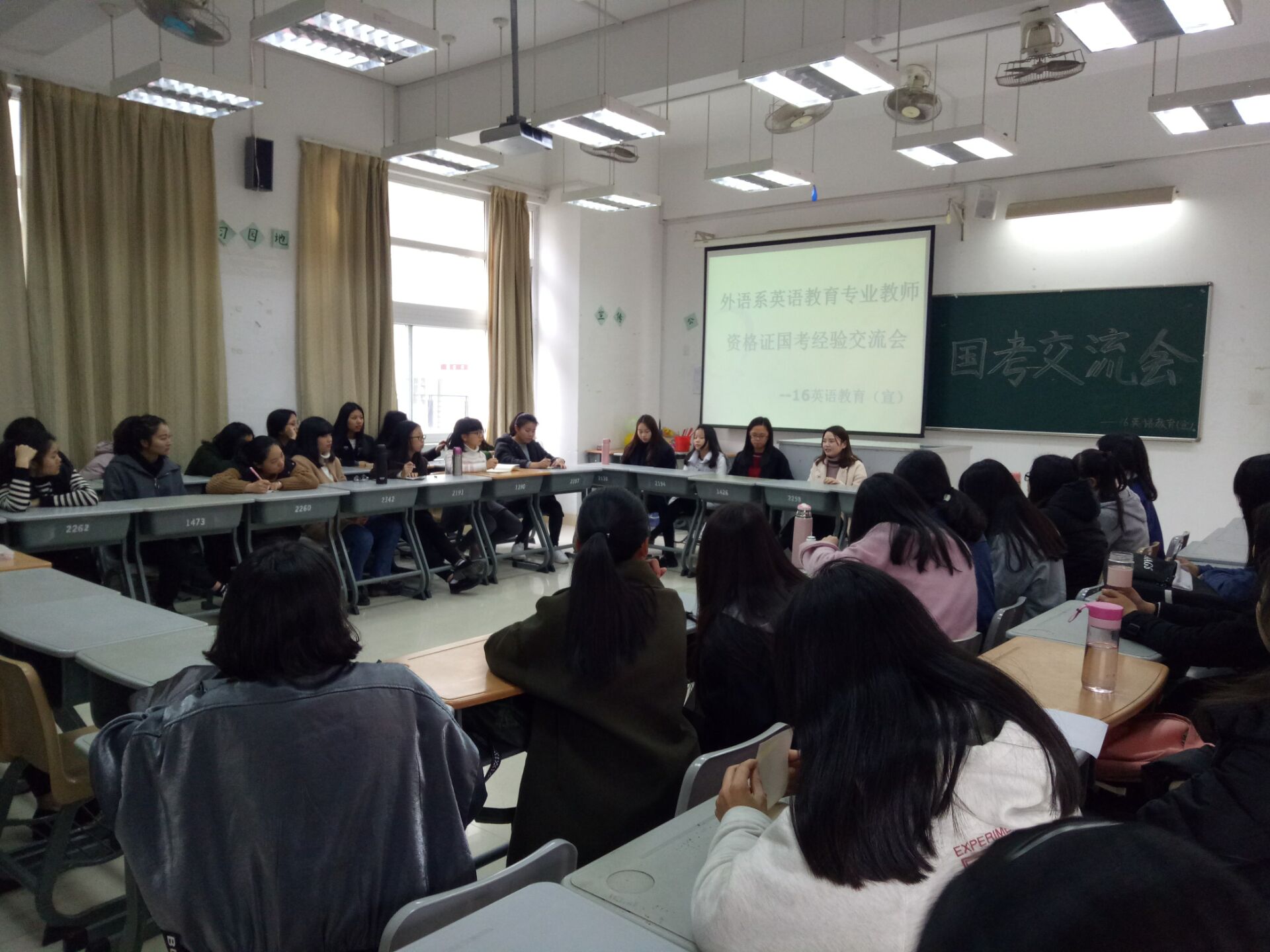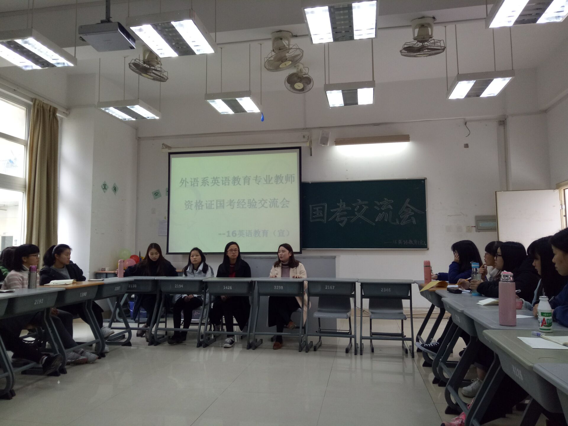 为了更好地迎接即将来临的教师资格证国考,2017年3月15日,16英语教育班同学开展了国考前交流会。
