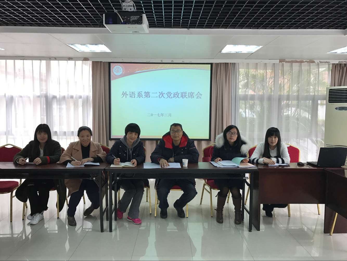 为进一步加强系部管理,2017年3月8日,外语系召开第二次党政联席会议。外语系党总支书记潘隹、系主任何少娴及两个专业教研室主任卢燕红、尤佳老师,马来语专任教师白丹妮及辅导员钱小莉老师参与此次会议。