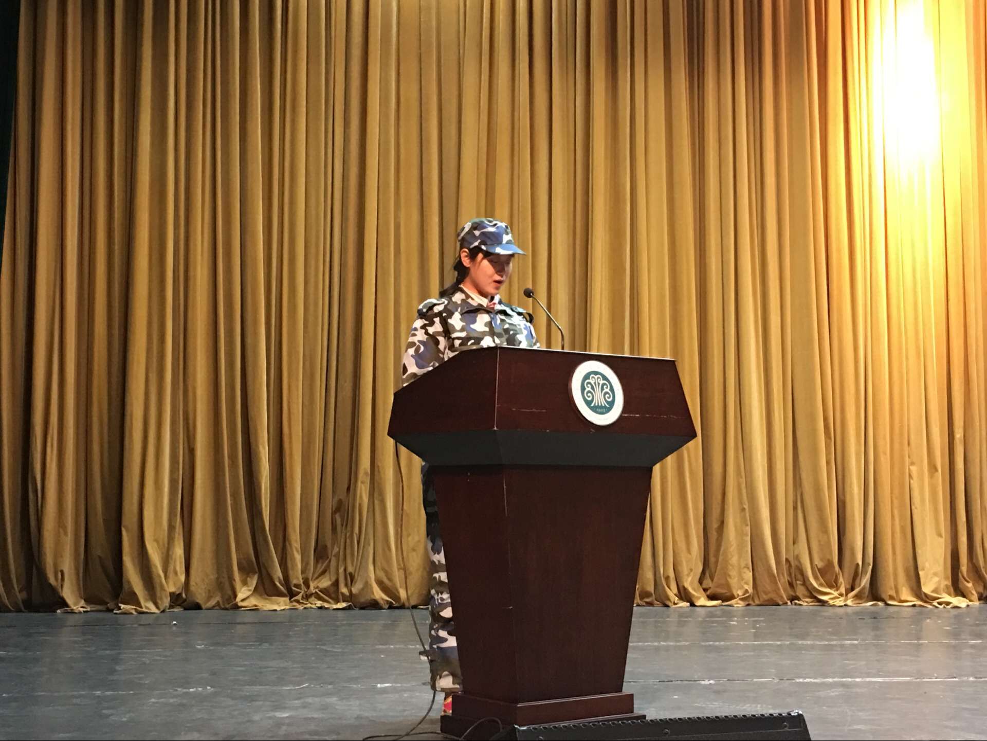 许*月同学在发言中回顾了军训期间的酸甜苦辣,并向我校各级领导,教官,老师,同学及先进集体与个人表示由衷的感谢和热烈的祝贺,最后希望大家能把军训中坚持不懈的精神继续发扬下去。此次发言赢得了台下观众的阵阵掌声。
