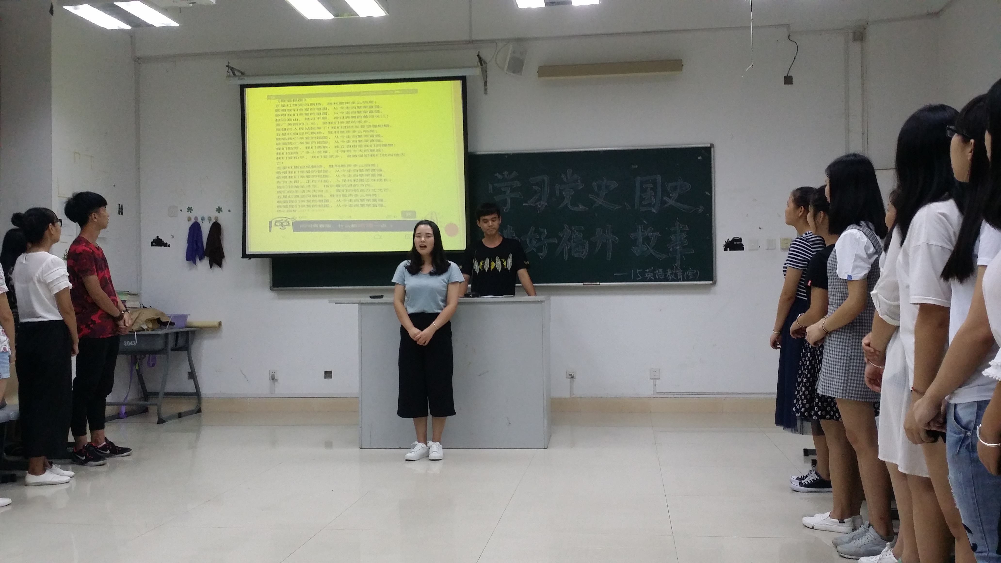 为了贯切落实习近平总书记关于“着力加强青少年思想道德建设,引导青少年践行社会主义核心价值观,团结教育广大青少年,听党话,跟党走,学习党史、国史,讲好中国故事”的指示精神,外语系15英语教育专业于10月27日在2003教室举办一次以“学习党史、国史,说好福州话”为主题的主题班会活动。