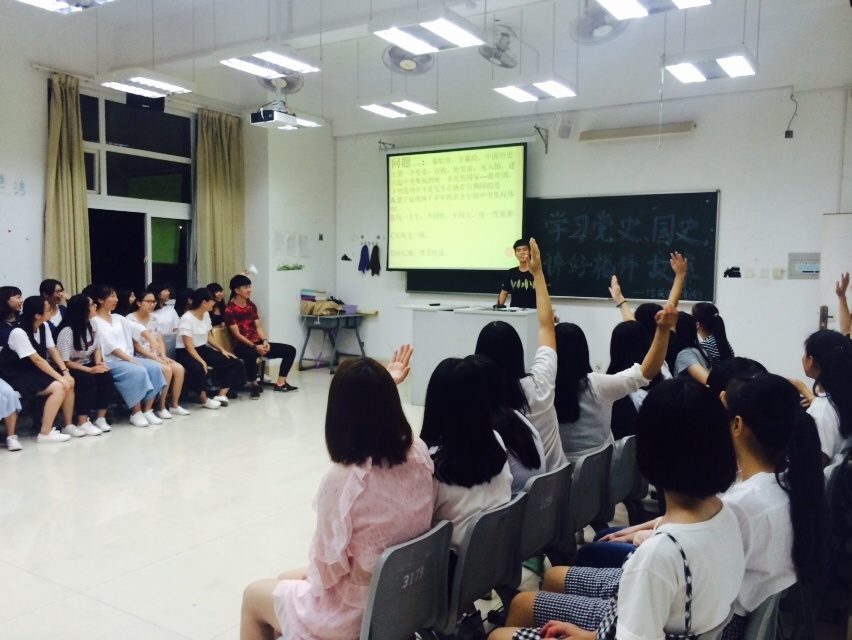 本次班会一开始全班共同合唱《歌颂祖国》,接着以热烈的掌声欢迎老师和评委的到来,由班长大概介绍开展此次班会的目的和具体流程。随后,进入本次班会的第一个模块,以20道基本国史的常识题,考察同学们的对国家历史的了解程度,并通过解释和公布答案向同学们更好的传达我国历史基本常识;紧接着进入第二模块,以简短视频的形式介绍党史,让同学们现场观看建党历史大事,观看结束后由班长口述总结该模块所要传达的主要内容和常识;最后以班上同学代表介绍福州本地的历史故事,进入班会的第三模块,以同学上台分享的形式,进一步调动班上同学的参与度,更好地达到此次班会的主要目的。