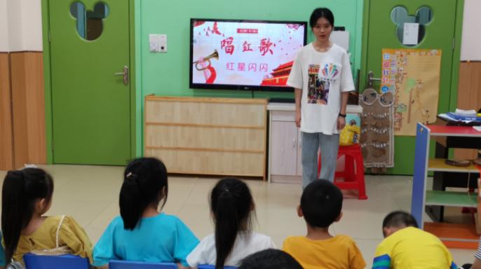传承红色经典、唱响红歌旋律。志愿者与小朋友们一起学习红色歌曲,如《红星闪闪》《我是小海军》《我爱北京天安门》等。志愿者们一边示范,小朋友一边跟唱,在歌曲中让孩子进一步感受到榜样的力量、祖国的伟大,在孩子们的心中播撒下爱党爱国的种子。